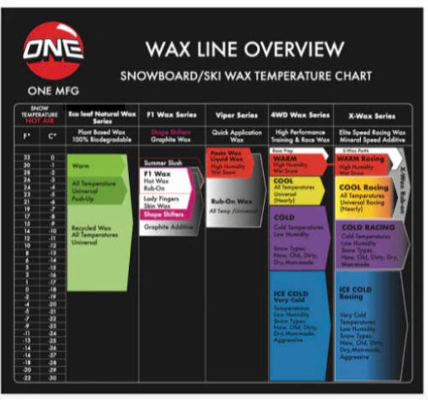 ONE MFG'S F1 Universal Conditions Speed Formula is Fast! Durable! Easy to apply and scrap! A proprietary blend of specially blended waxes with decades of testing results and podiums to back-up the proven F1 Formula. Use alone or combine with any of our waxes, including graphite and X-Wax. Performance Range: 28ºF to 21ºF (-2ºC to -6ºC)